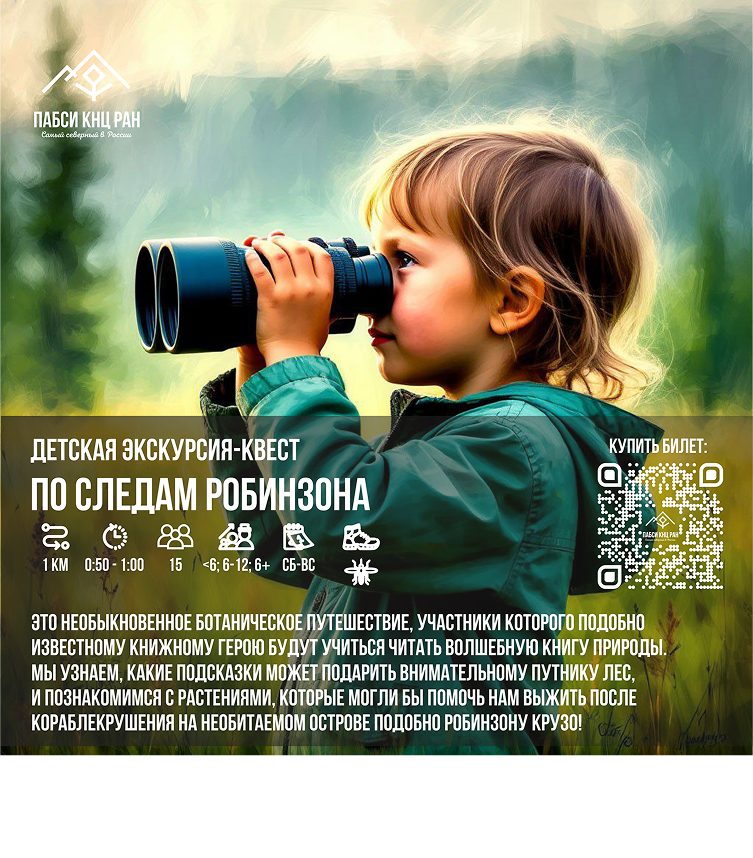 Экскурсия-квест «ПО СЛЕДАМ РОБИНЗОНА» — это необыкновенное ботаническое путешествие, участники которого подобно известному книжному герою будут учиться читать волшебную книгу природы. Мы узнаем, какие подсказки может подарить внимательному путнику лес, и познакомимся с растениями, которые могли бы помочь нам выжить после кораблекрушения на необитаемом острове подобно Робинзону Крузо!