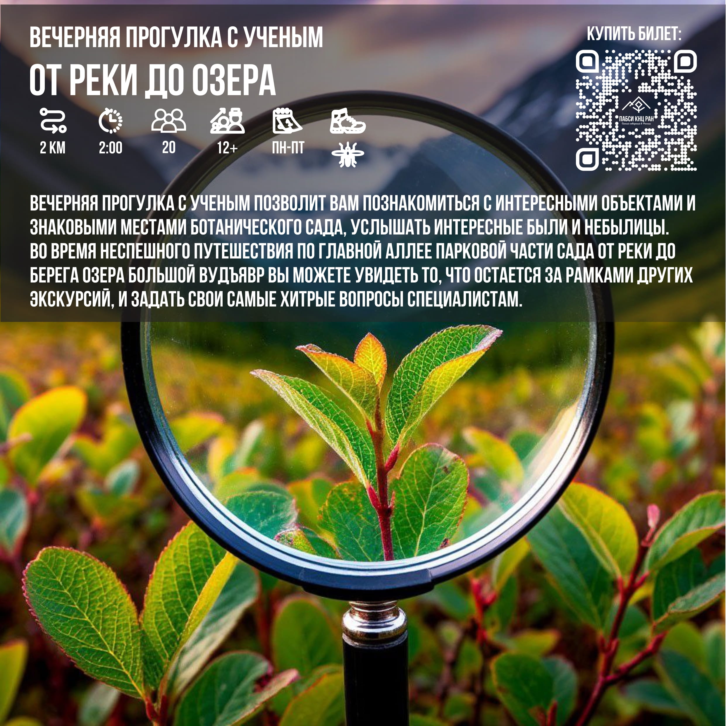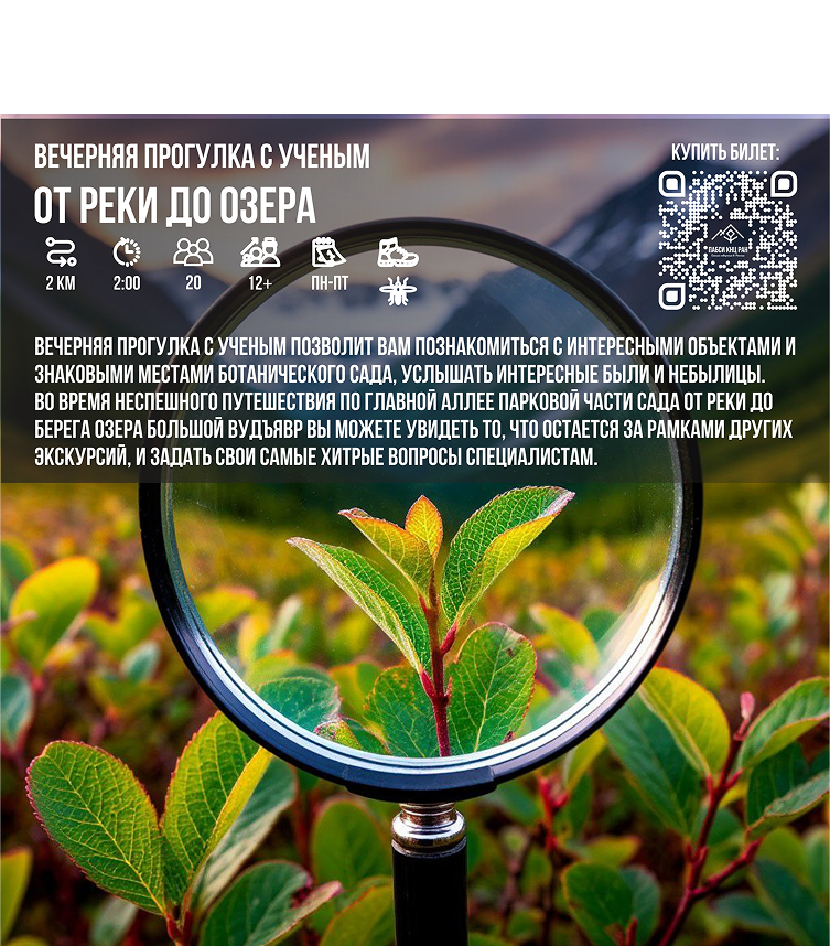 Вечерняя прогулка с ученым позволит вам познакомиться с интересными объектами и знаковыми местами Ботанического сада, услышать интересные были и небылицы. Во время неспешного путешествия по главной аллее парковой части Сада от реки до берега озера Большой Вудъявр вы можете увидеть то, что остается за рамками других экскурсий, и задать свои самые хитрые вопросы специалистам.