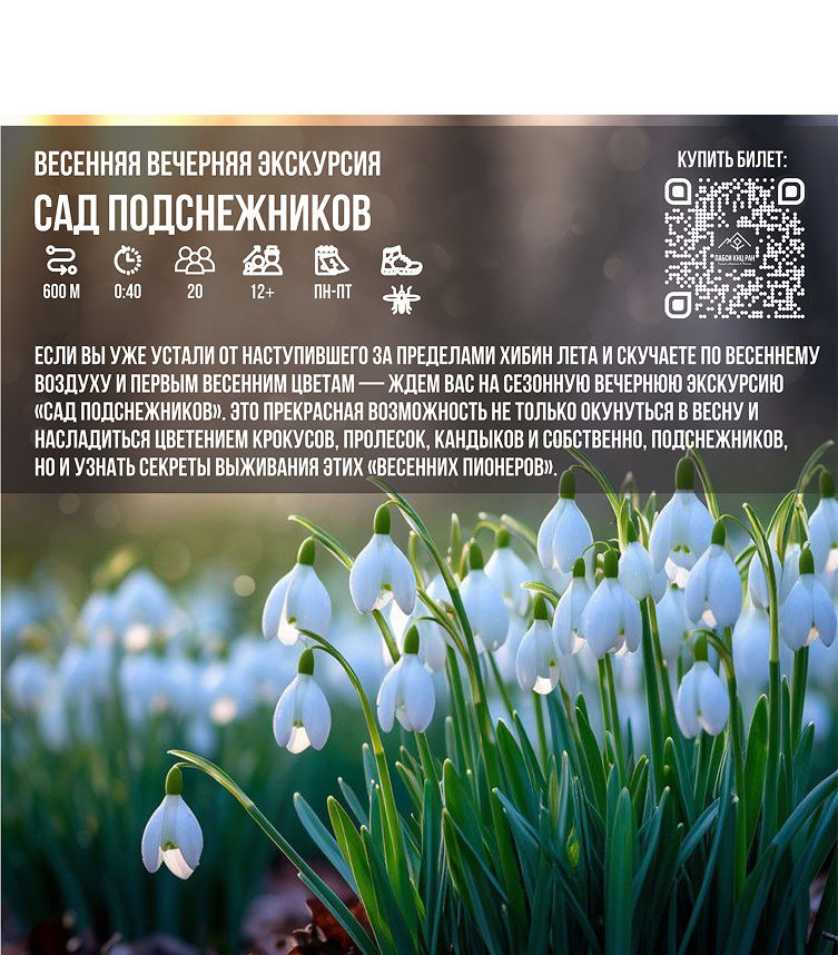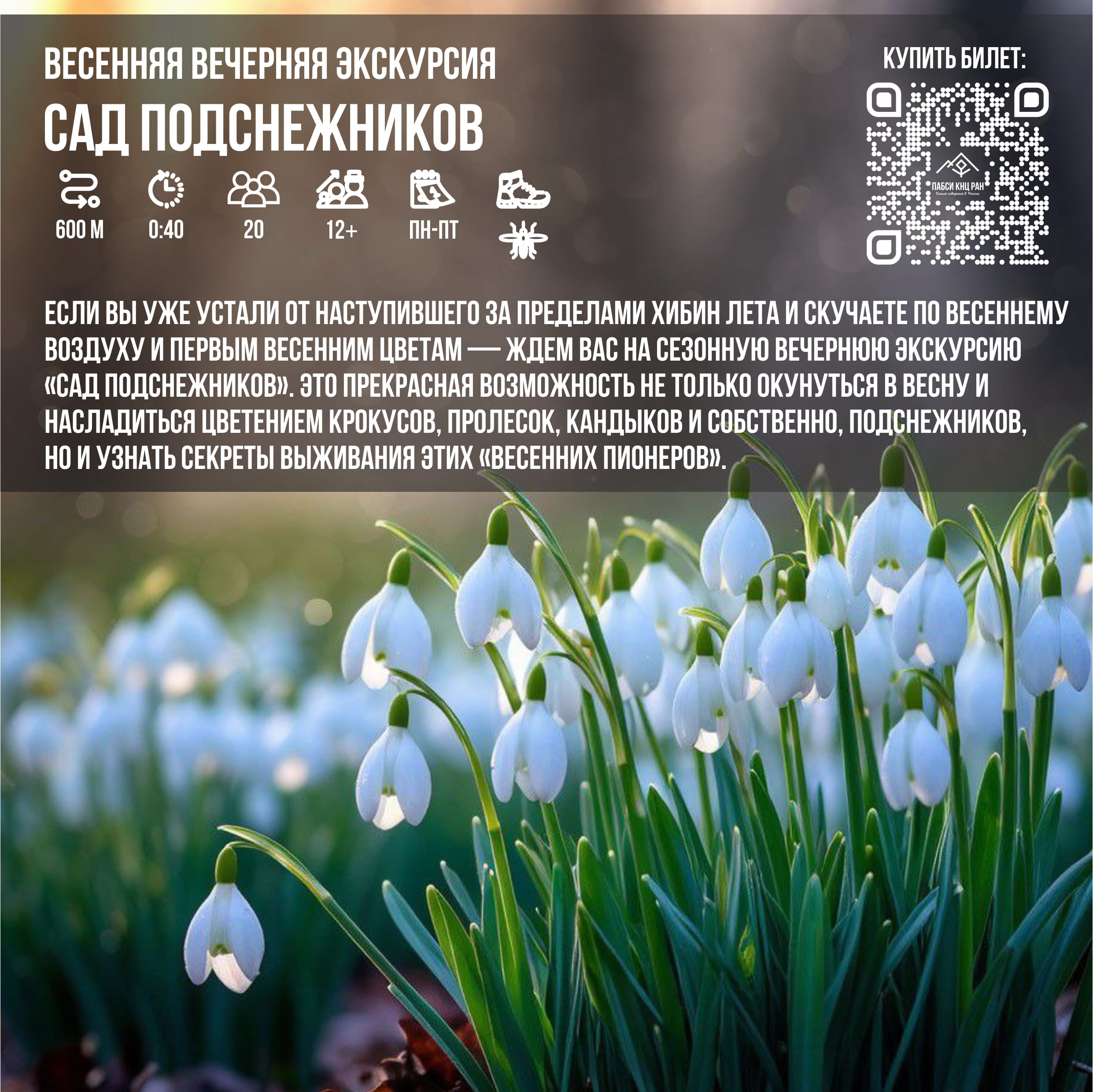 Если вы уже устали от наступившего за пределами Хибин лета и скучаете по весеннему воздуху и первым весенним цветам — ждем вас на сезонную вечернюю экскурсию «Сад подснежников». Это прекрасная возможность не только окунуться в весну и насладиться цветением крокусов, пролесок, кандыков и собственно, подснежников, но и узнать секреты выживания этих «весенних пионеров».