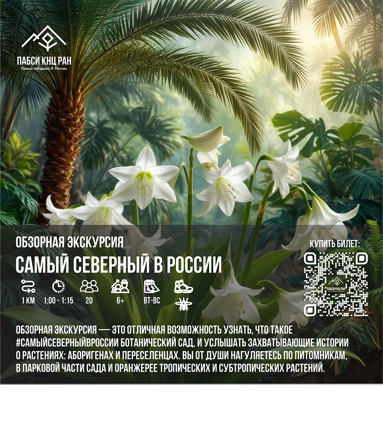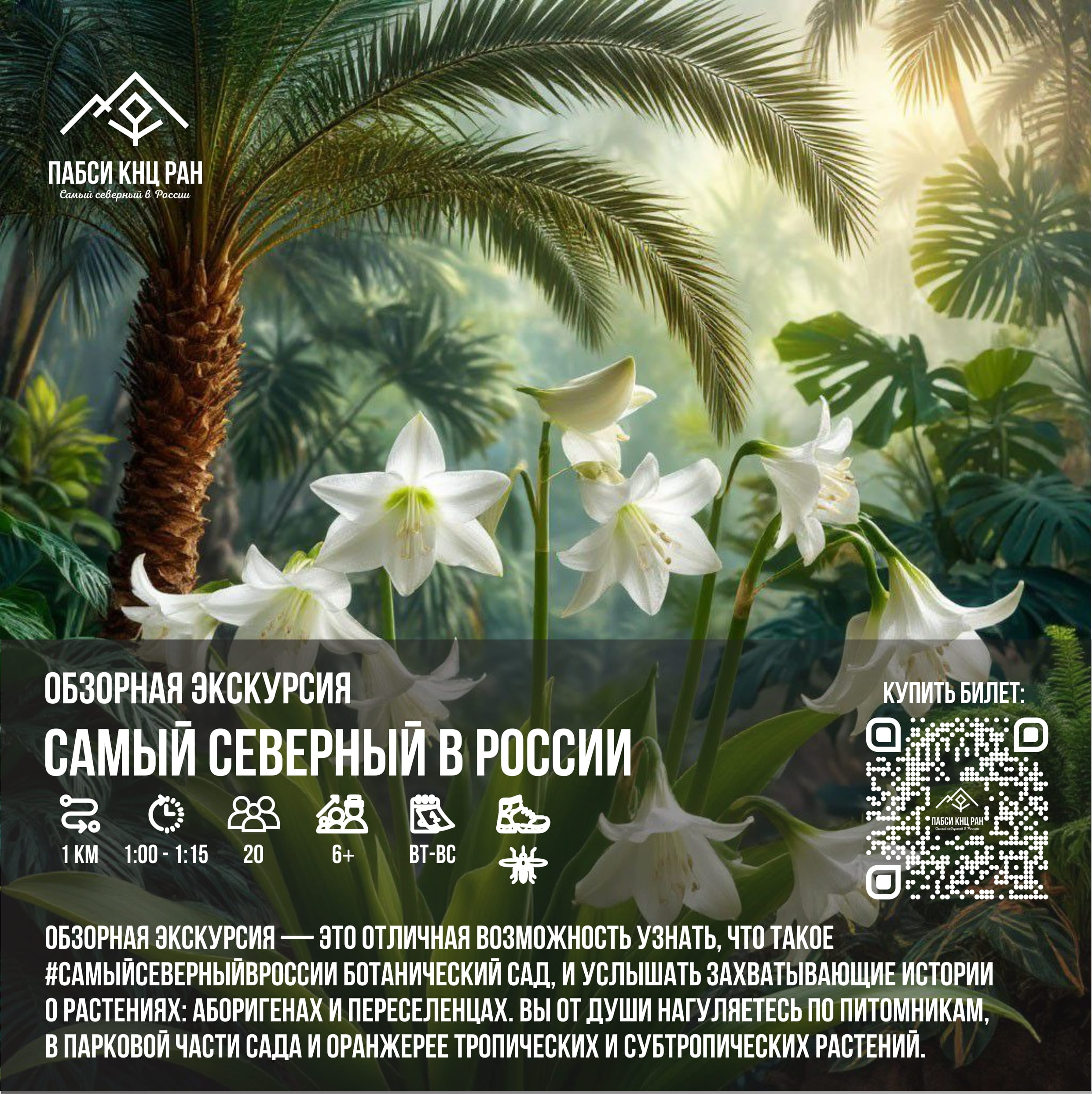 Обзорная экскурсия — это отличная возможность узнать, что такое #самыйсеверныйвроссии ботанический сад, и услышать захватывающие истории о растениях: аборигенах и переселенцах. С июня по сентябрь путешествие включает в себя прогулку по питомникам, расположенным в парковой части Сада, и посещение оранжереи тропических и субтропических растений. Зимой гостей ждет короткая прогулка по парку, а затем — большое «тропическое» путешествие по оранжерее и знакомство со множеством необычных растений, переехавших в Арктику из различных уголков мира.