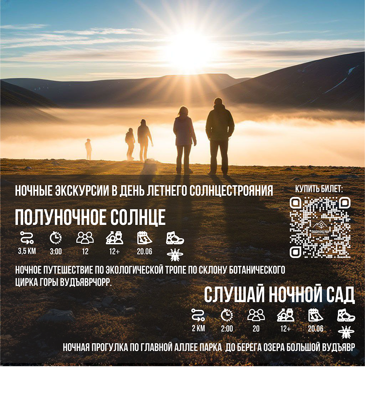 Только два раза в течение лета – в ночь летнего солнцестояния и накануне Ивана Купалы приглашаем на ночные прогулки по Саду. Это ботаническое и релаксационное путешествие по главной аллее парка от реки Вудъяврйок до берега озера Большой Вудъявр подарит вам новые знания, свежие ощущения, отличные фотографии и летнее настроение. Ну и без сюрпризов не обойдется!
