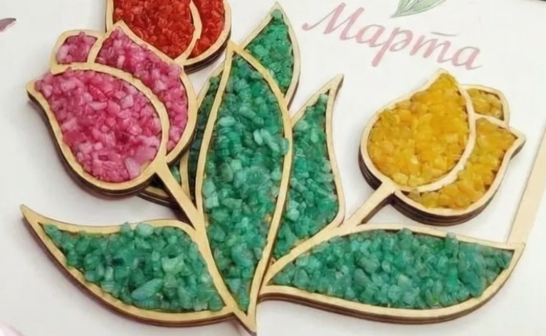 Что объединяет камень и нежный цветок? Правильно: тюльпан из мелких цветных камней, выполненный в технике мозаики.