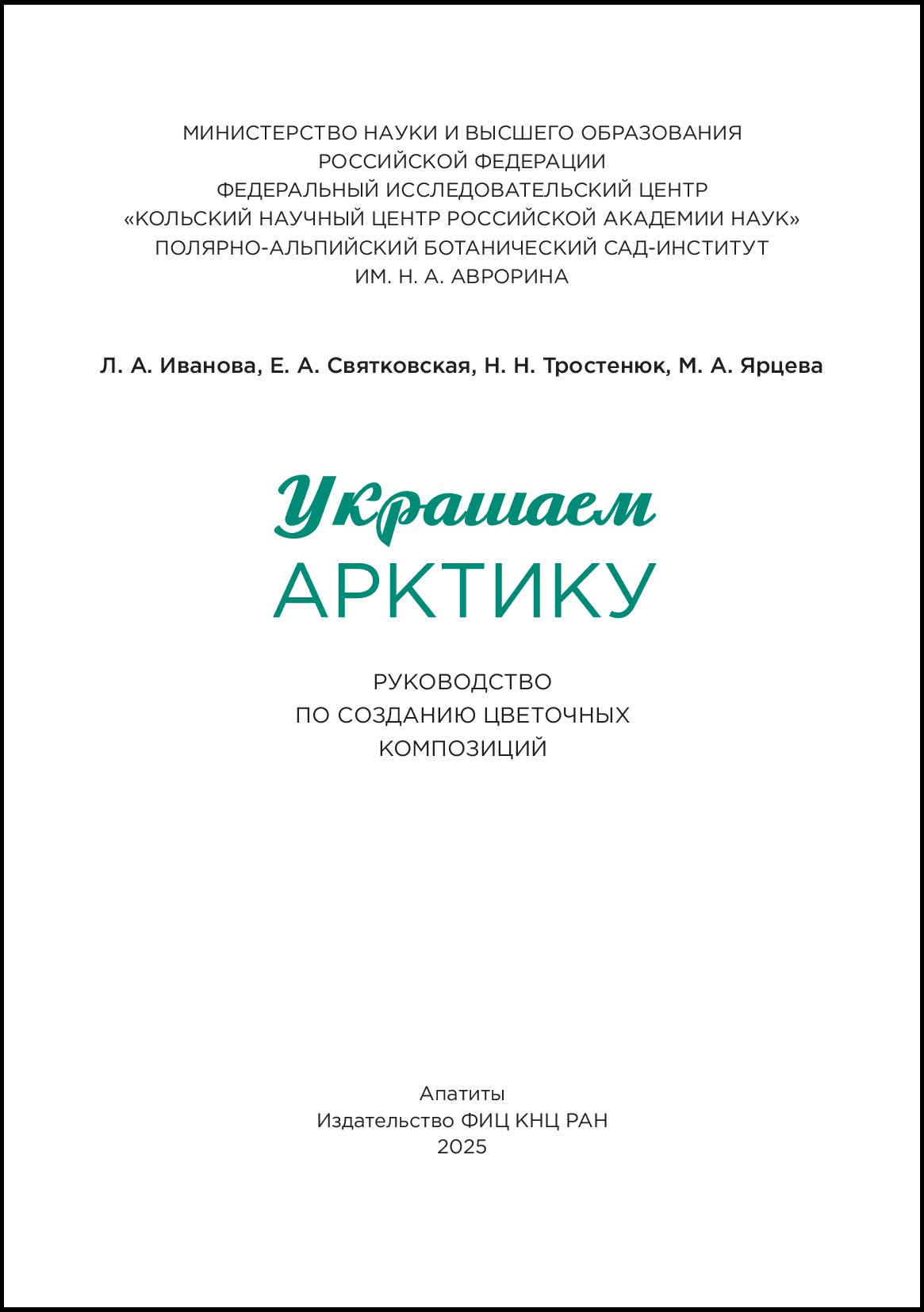Украшаем Арктику. Руководство по созданию композиций. / Л. А. Иванова, Е. А. Святковская, Н. Н. Тростенюк, М. А. Ярцева ; отв. ред. докт. биол. наук Д. А. Давыдов, канд. биол. наук Е. А. Боровичев. — Апатиты: Издательство ФИЦ КНЦ РАН, 2025. — 180 с.: ил. ISBN 978-5-91137-535-5