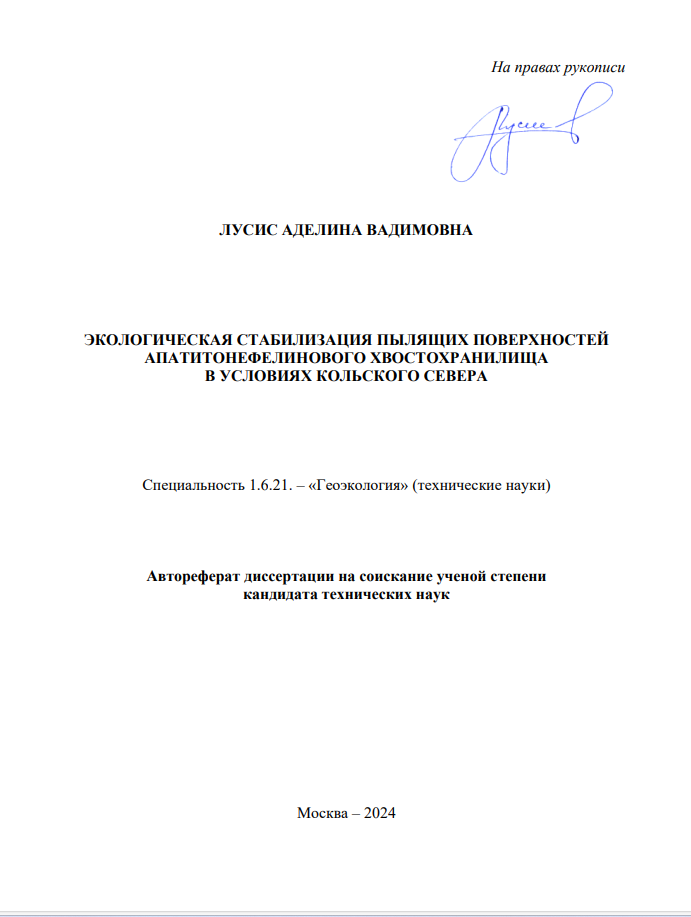 Выпускница аспирантуры Полярно-альпийского ботанического сада-института КНЦ РАН Аделина Лусис подготовила работу на тему «Экологическая стабилизация пылящих поверхностей апатитонефелинового хвостохранилища в условиях Кольского Севера» под научным руководством заведующей лабораторией декоративного цветоводства и озеленения, доктора биологических наук Любови Ивановой.