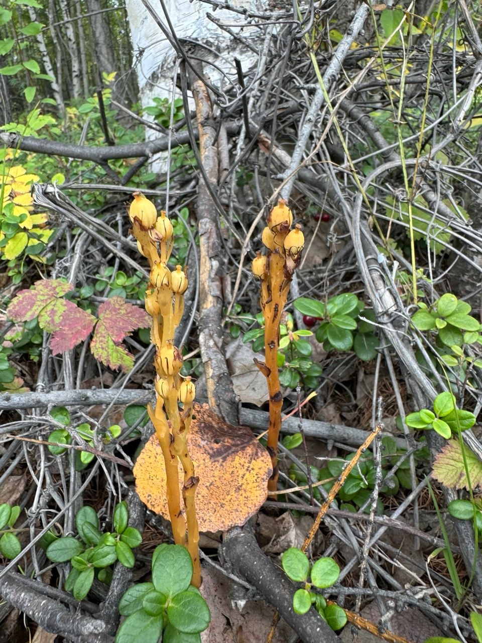 «После долгой поездки мы остановились размять ноги. Во время прогулки обнаружили не только большое скопление маслят, но и неизвестное бесхлорофилльное сапрофитное растение. Это вызвало у меня особый интерес, поскольку бесхлорофилльных растений на Камчатке довольно мало. Из известных видов можно назвать бошнякию русскую, других представителей сразу и не припомню», – описывает интересную находку старший научный сотрудник лаборатории флоры и растительности.